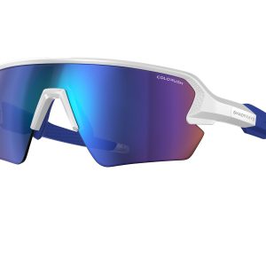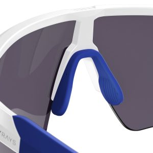 - Gloss white TR-90 frame with blue rubber grips designed for a flexible lightweight fit and extreme durability.